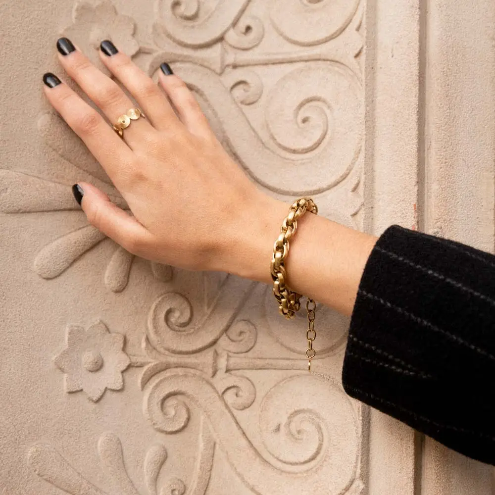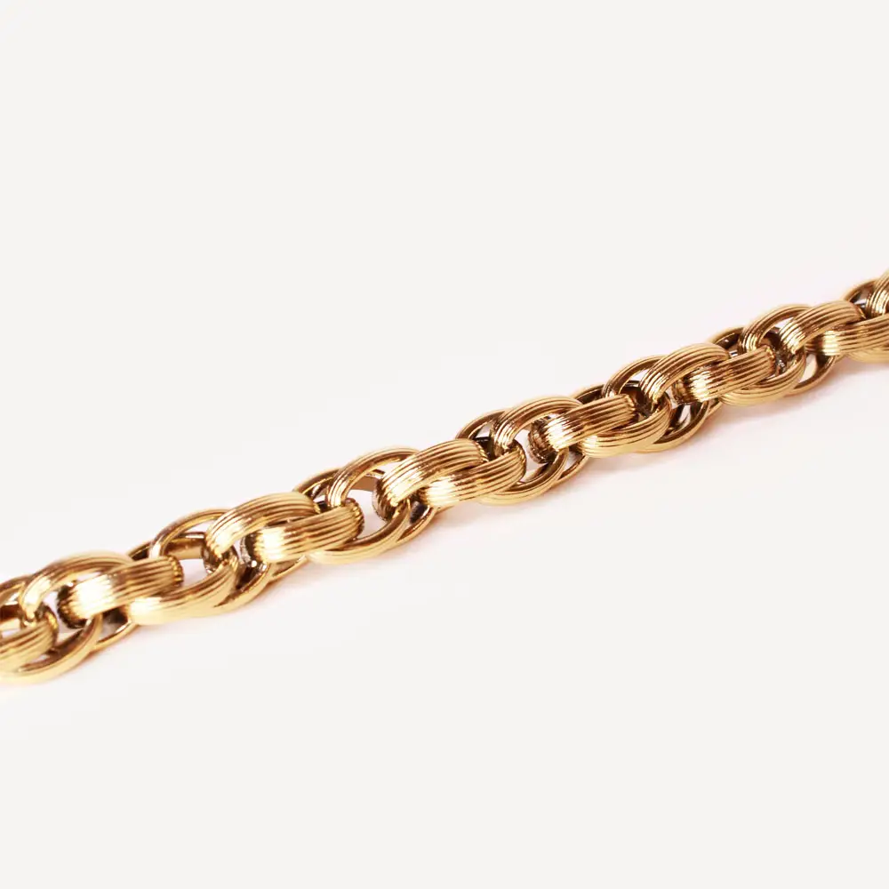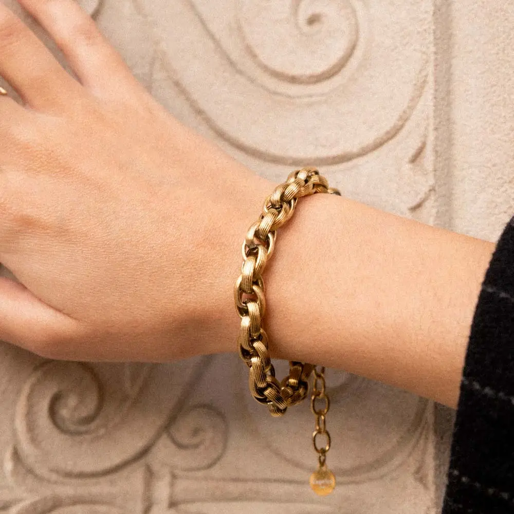 Ein Vintage-inspiriertes Armband mit breiten, ineinander verschlungenen und ziselierten Gliedern und einer bewusst dunklen Goldfarbe für ein originelles und glamouröses Design