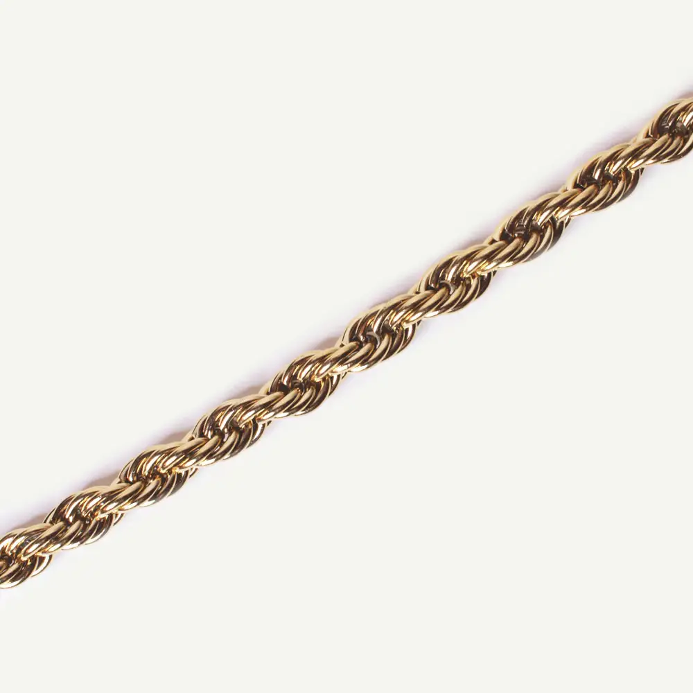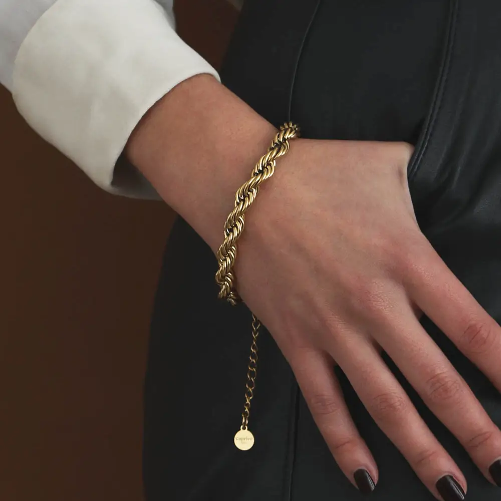 Das MONICA-Armband ist eine breite, geflochtene Kordelkette mit gedrehtem und kontinuierlichem Design. Leicht und fließend, schmiegt es sich elegant und unauffällig an das Handgelenk an.