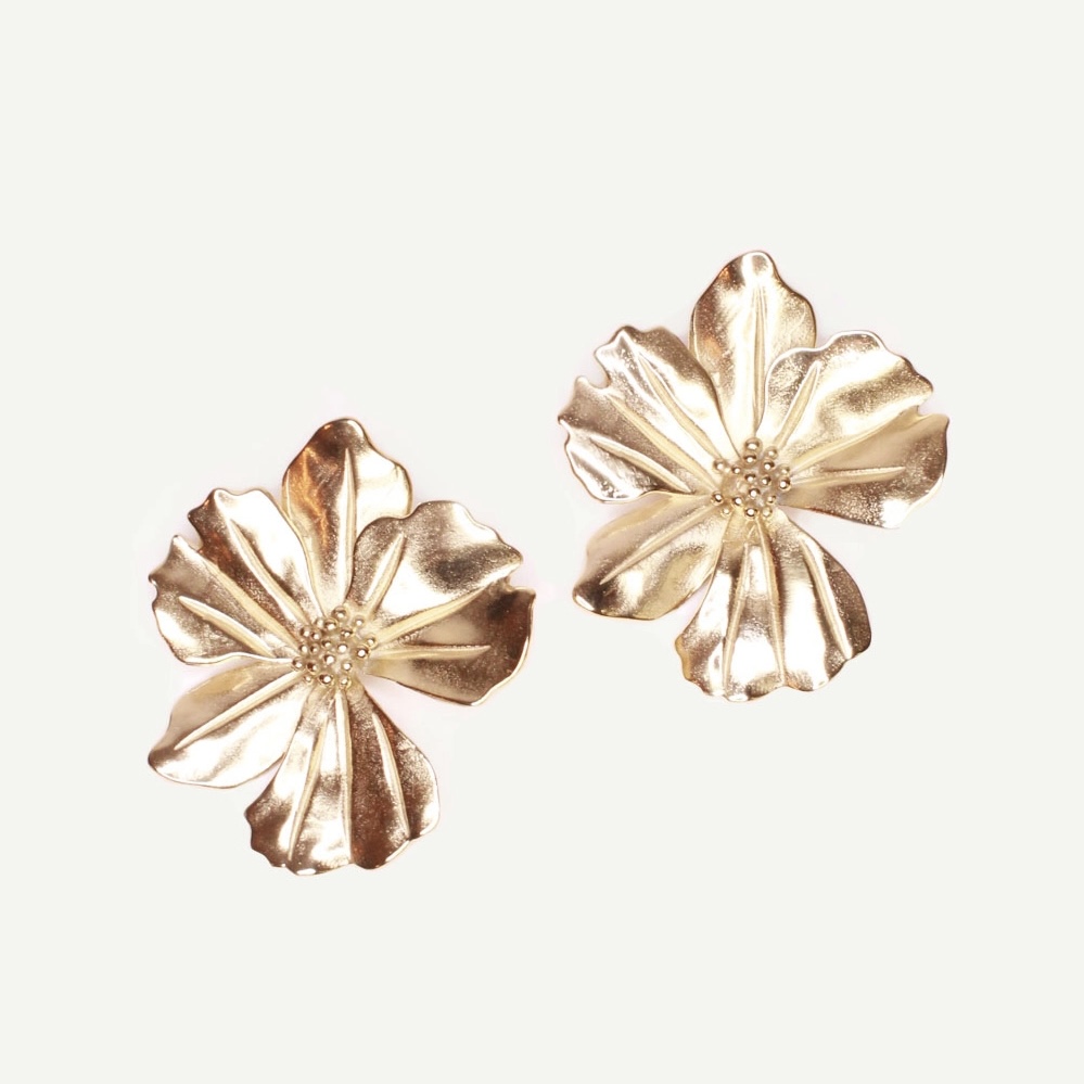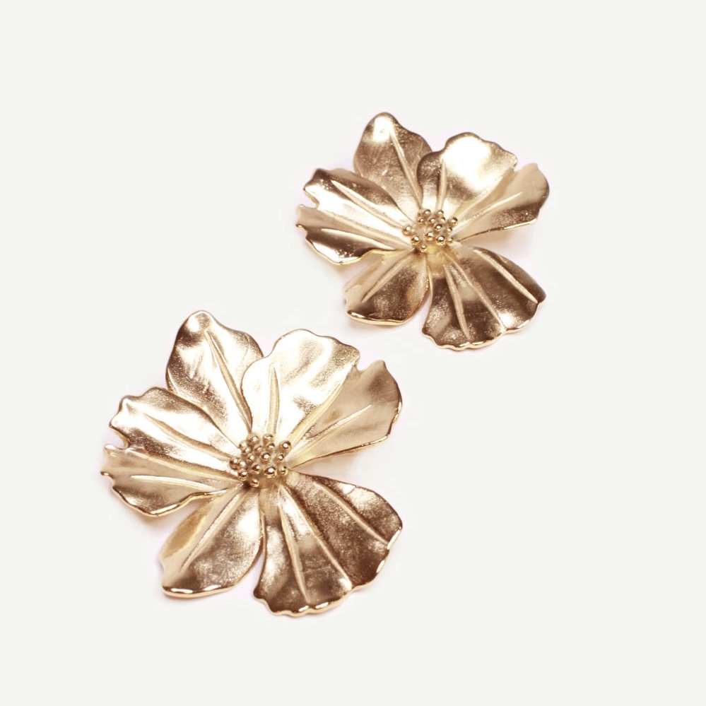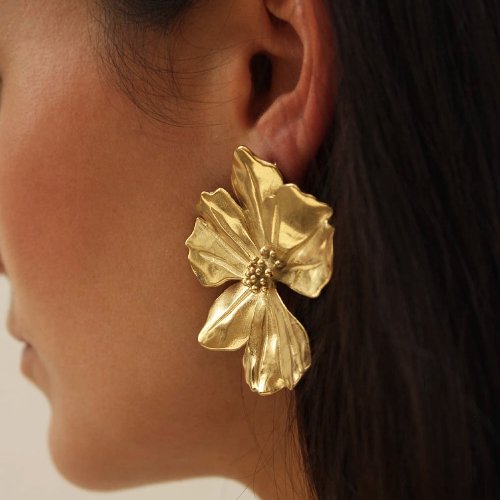 Große Designer-Ohrringe in Form von Blumen mit glänzender Oberfläche, die das Licht subtil reflektieren. Solar-Look und Eleganz garantiert. Ein Statement-Designer-Schmuckstück, das garantiert alle Blicke auf sich zieht!