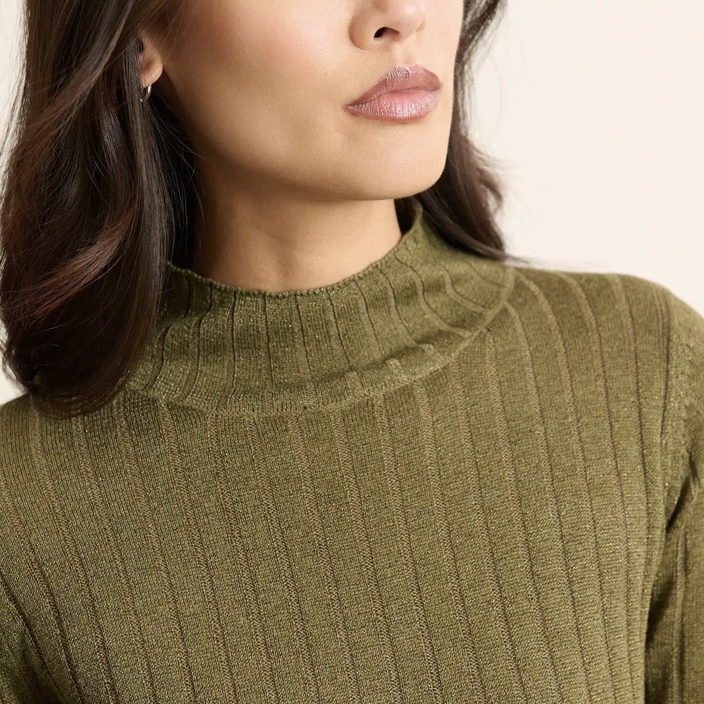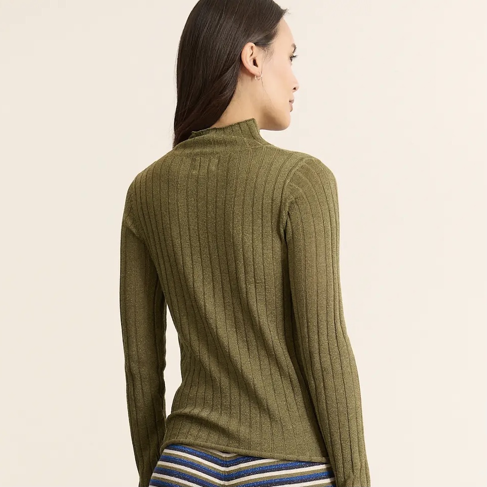 PISTACHE ist ein eng anliegender Pullover in einem warmen Olive mit Merinowolle und Lurex Highlights. Mit seinem zurückhaltendendem und elegantem Stehkragen eignet er sich perfekt für Lagenlooks.