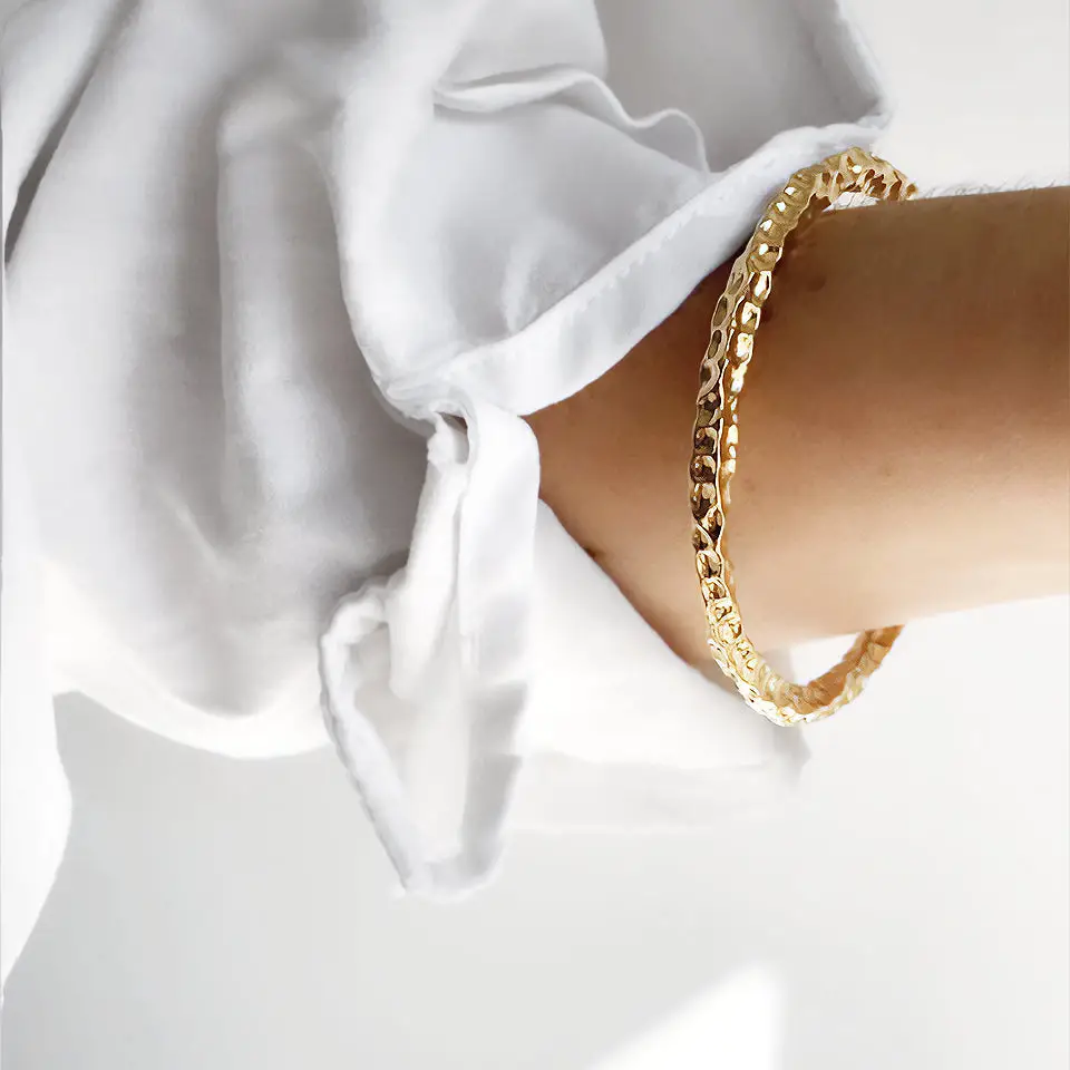 Dieser Armreif zeichnet sich durch seine Zartheit und zugleich Stärke aus. Die schlichte Eleganz und die gehämmerte Haptik verleiht diesem Schmuckstück ganz viel Klasse und Einzigartigkeit.