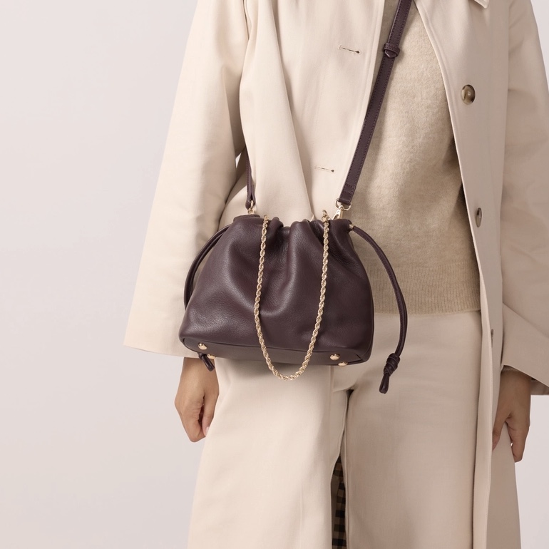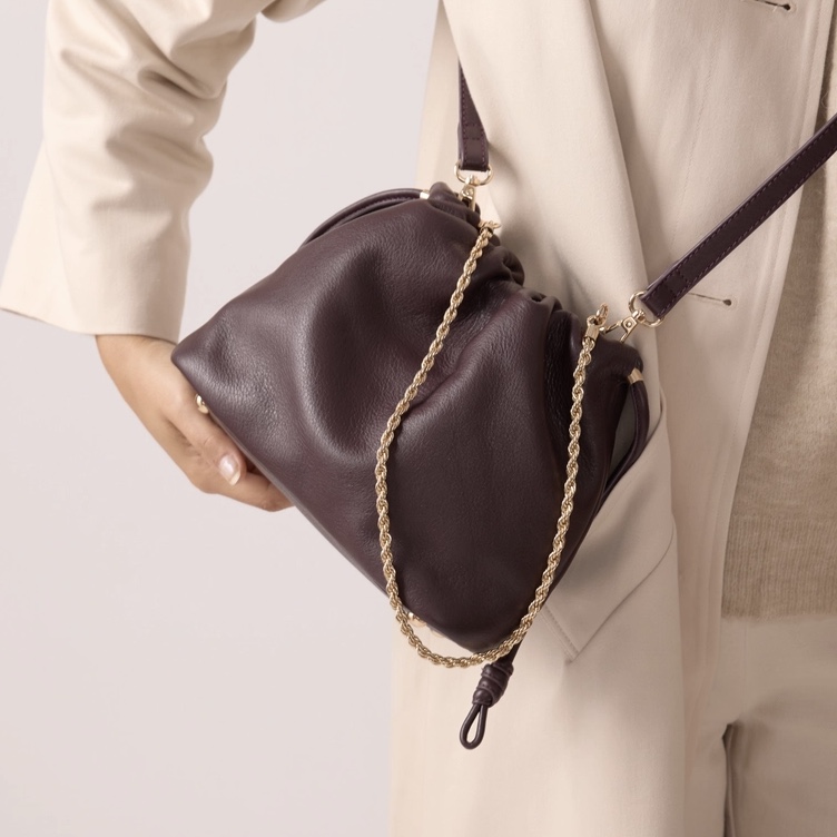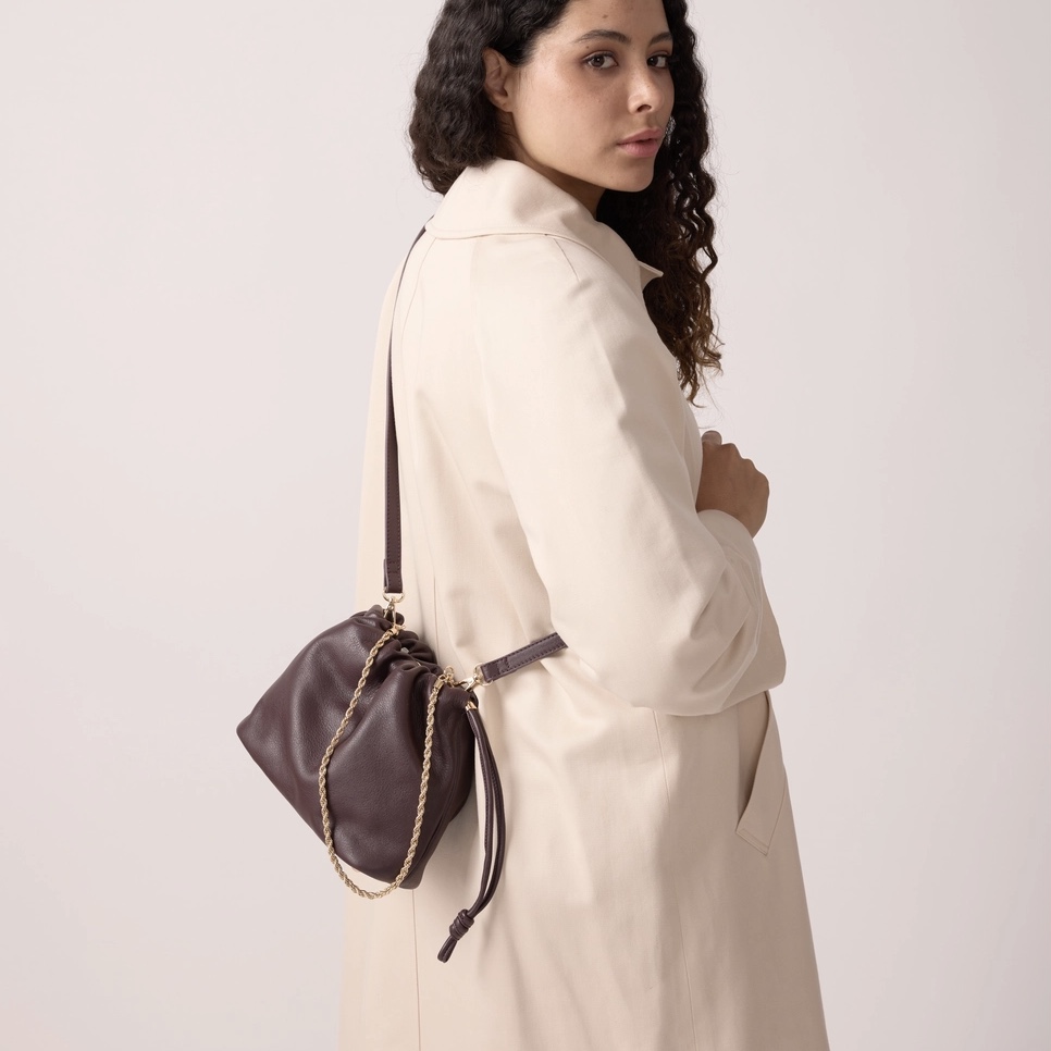 Die TESSA-Tasche in einem feige Farbton aus Rindsleder mit pflanzlicher Gerbung besticht durch ihr leuchtendes und raffiniertes Design, ihre weiche Form und die gedrehte goldene Kette, die jedem Ihrer Looks einen schicken und zeitgemäßen Touch verleiht.