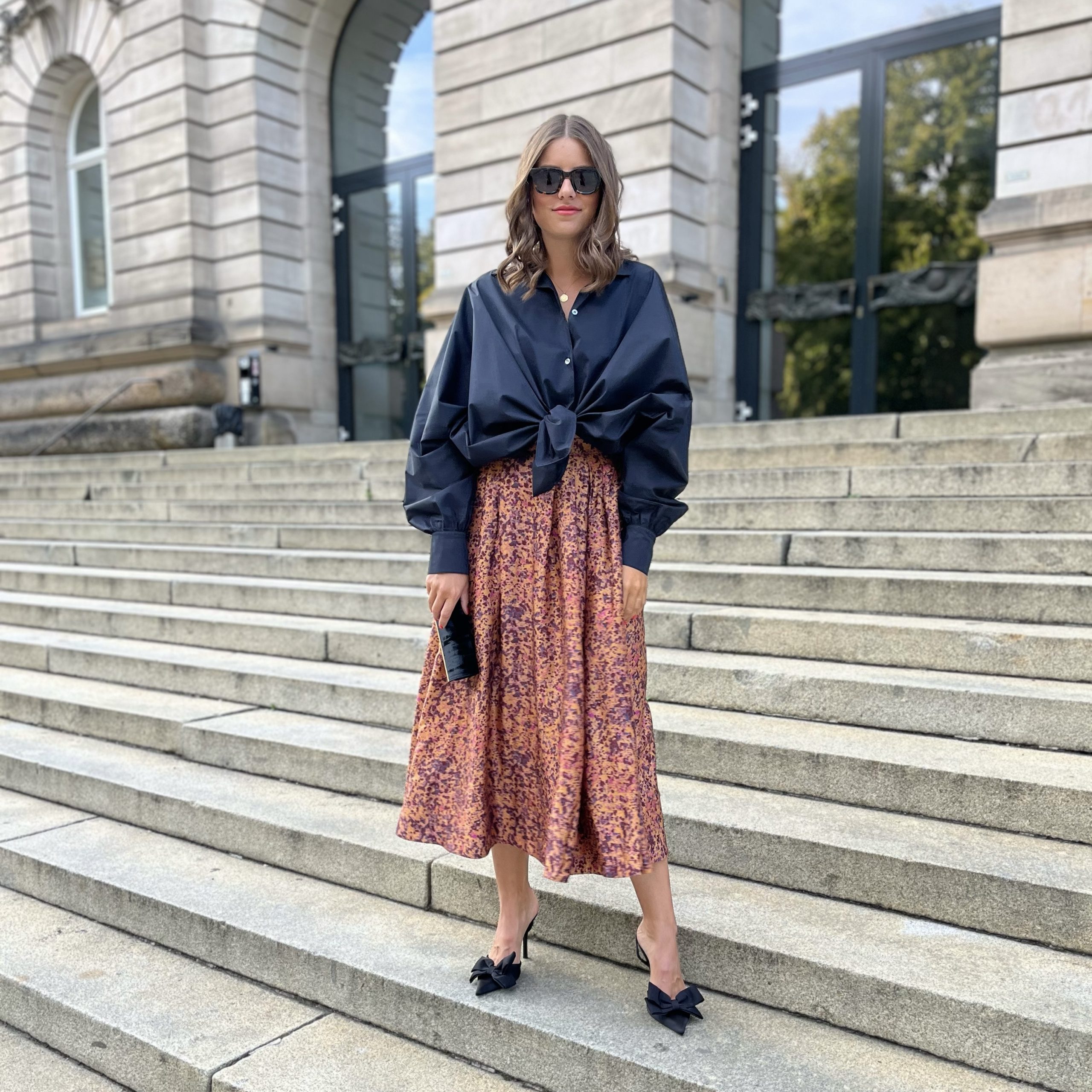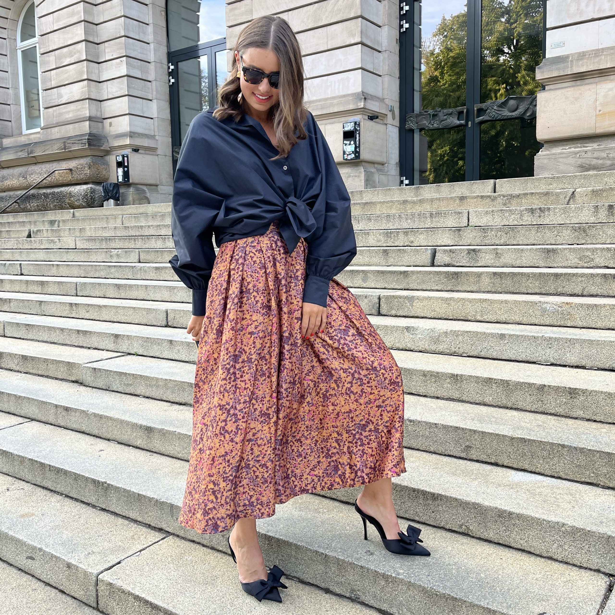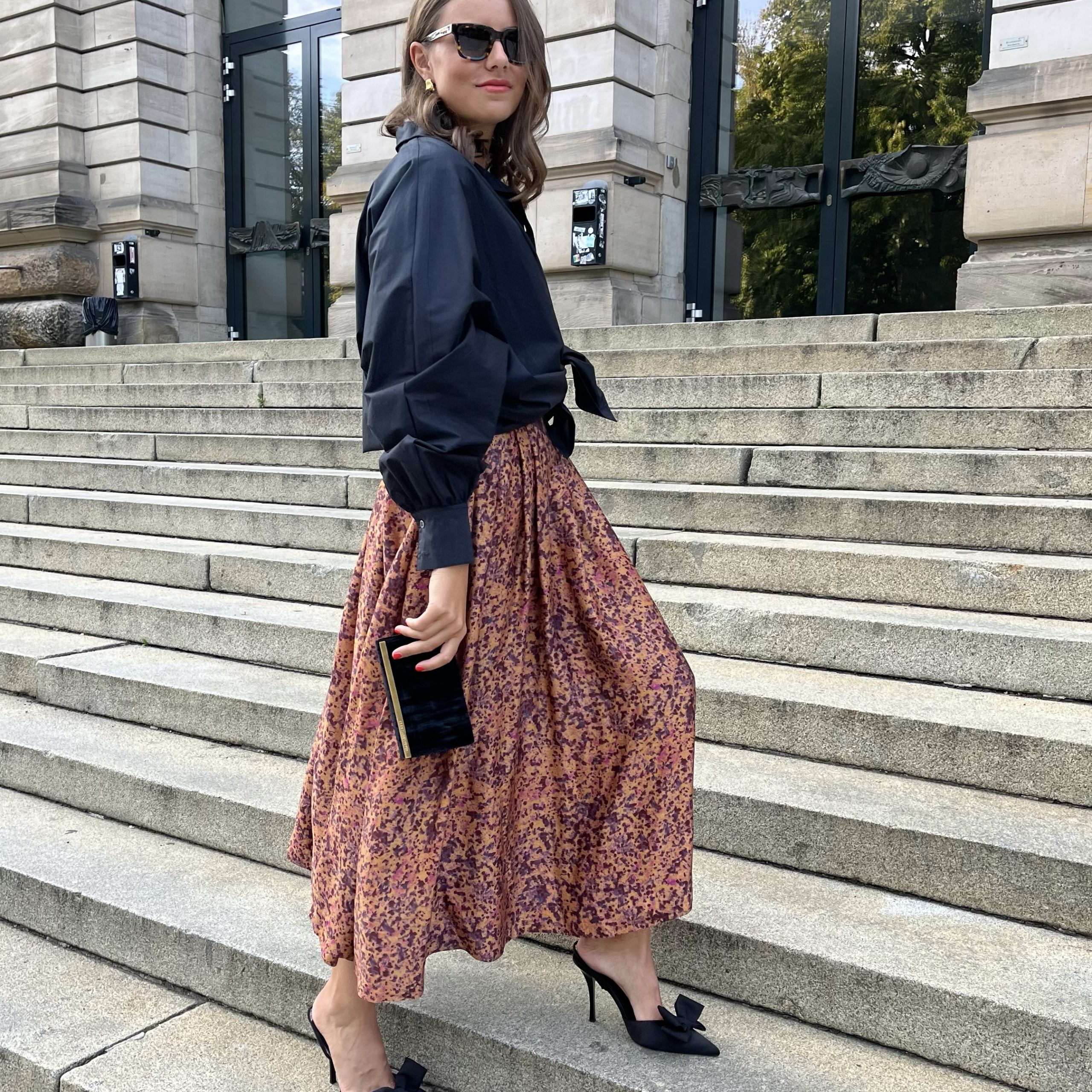 Die einzigartige Wirkung des Rocks wird durch das besondere Tupfen-Muster in erdigen Tönen komplettiert und dem seidige Finish komplettiert.