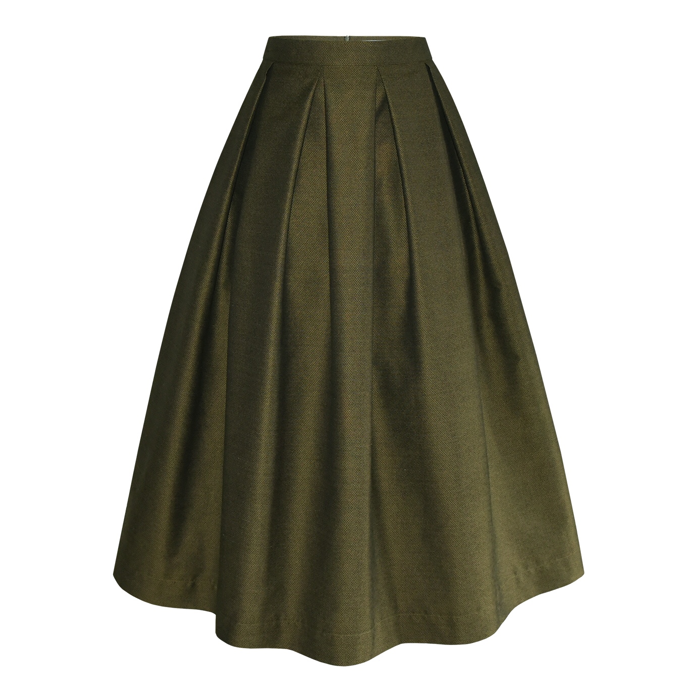 Edel und in klassisch ausgestellter Silhouette ist unsere MANON in einem schimmernden olivgrün ein absoluter evergreen und vielseitig kombinierbar.