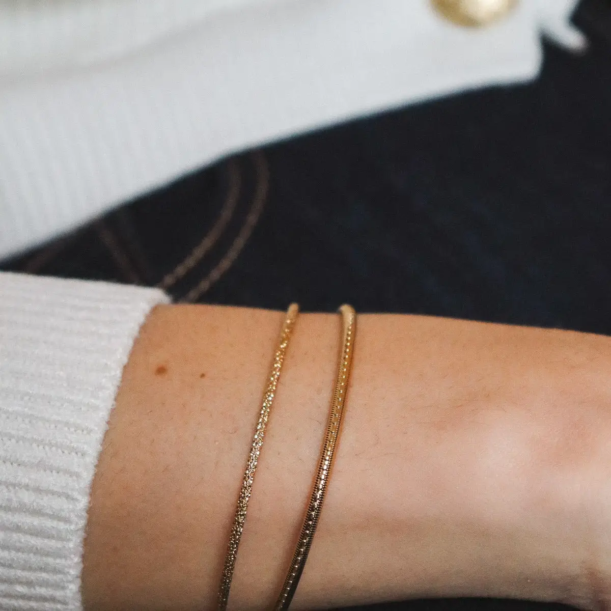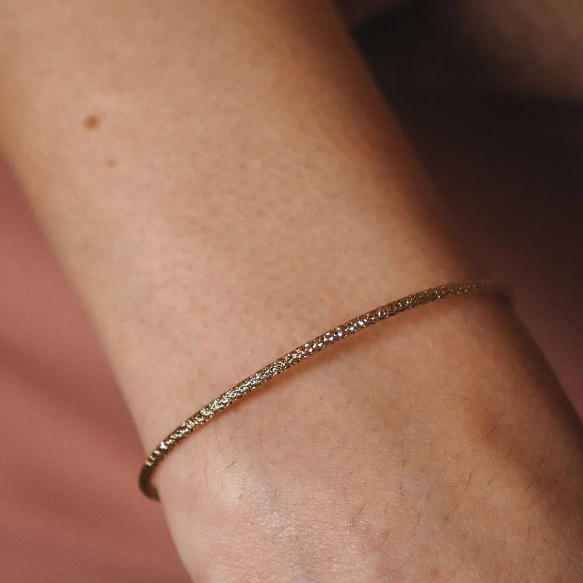 Der NOÉ Armreif zeichnet sich durch seine Zartheit sowie Schlichtheit aus. Die gehämmerte Optik reflektiert wunderbar das Licht und den Glanz. Er eignet sich perfekt um es auch mit mehreren Reifen zu kombinieren.